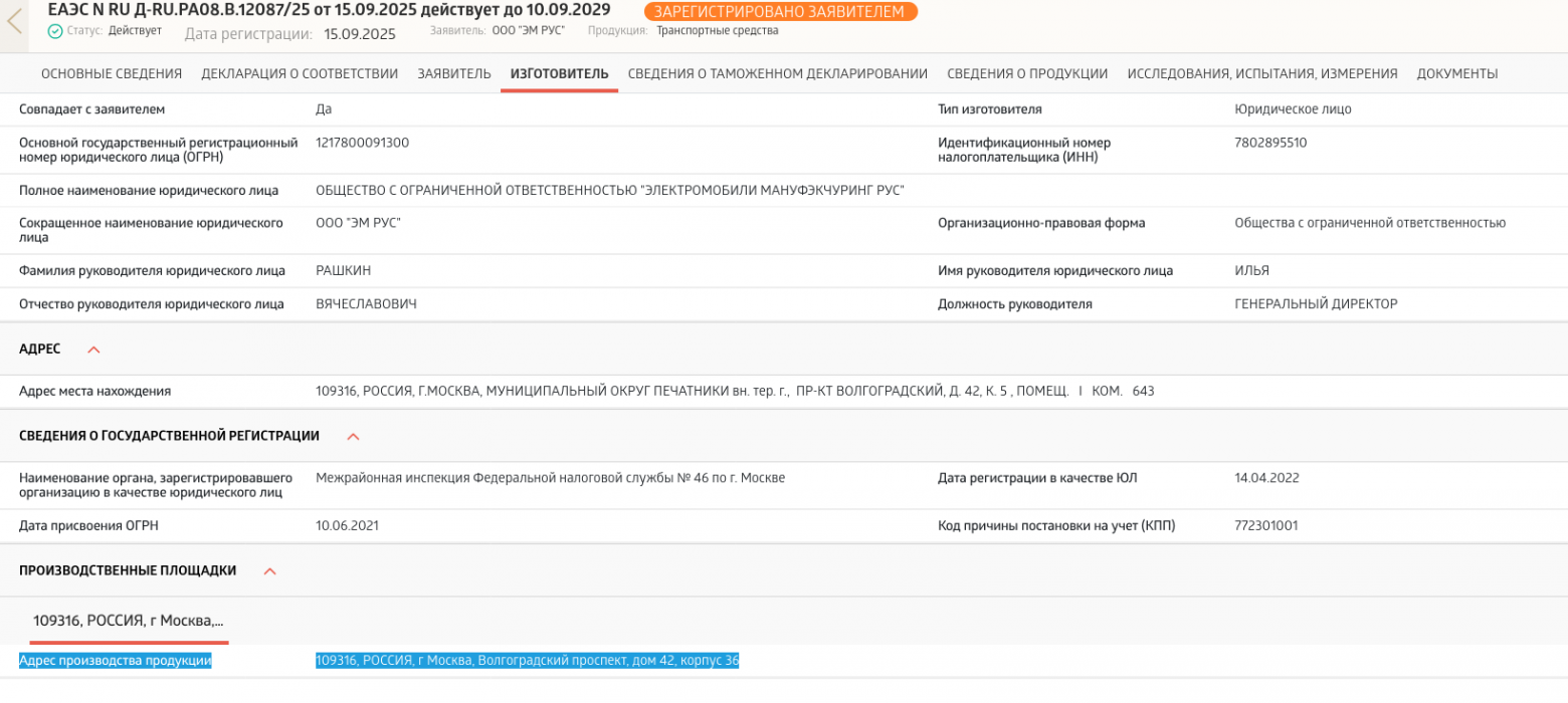 Любопытная деталь: в официальной документации «Яндекс» нигде не фигурирует. Заявителем выступает ООО «ЭМ Рус», изготовителем — завод «Москвич». По оценке отраслевых экспертов, это не столько проект «Яндекса», сколько проект для «Яндекса».