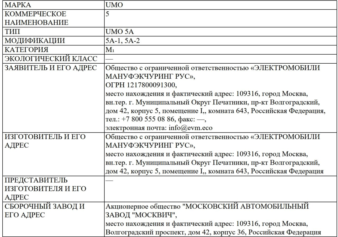 Согласно данным отраслевых источников в сфере автомобилестроения, на проект электромобиля UMO U5 от «Яндекса» — фактически копию китайской модели GAC Aion Y Plus — получены необходимые документы: ОТТС (Одобрение типа транспортного средства) и Декларация о соответствии требованиям технического регламента Евразийского экономического союза. Производство будет организовано совместно компаниями «ЭМ Рус» (EVM) и заводом «Москвич» в интересах «Яндекса», реализацией занимается проект «Яндекс Электро».
